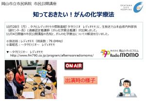 レディオモモ(岡山シティエフエム)の番組『岡山シティインフォメーションスクエア』の火曜日の健康シリーズのうち、第4火曜日は岡山市立市民病院の職員が出演して、身近な健康の話題や市民病院の情報を発信しています。