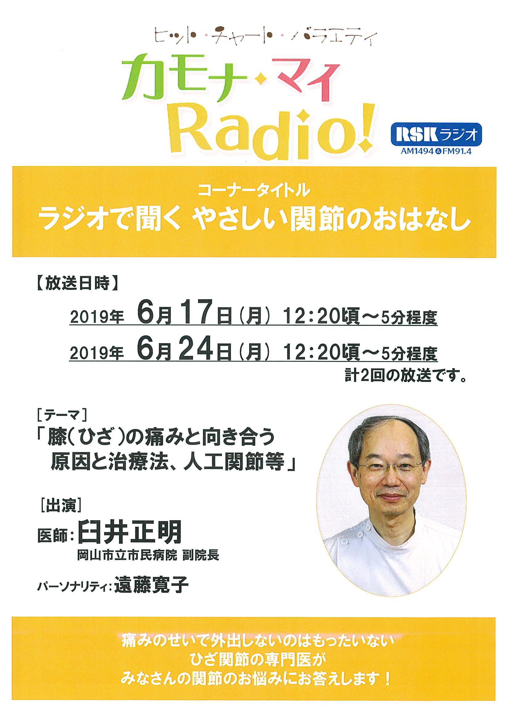 RSKラジオのヒットチャートバラエティ番組『カモナ・マイ・Radio!』で、当院の臼井副院長が6月後半に2回出演します。